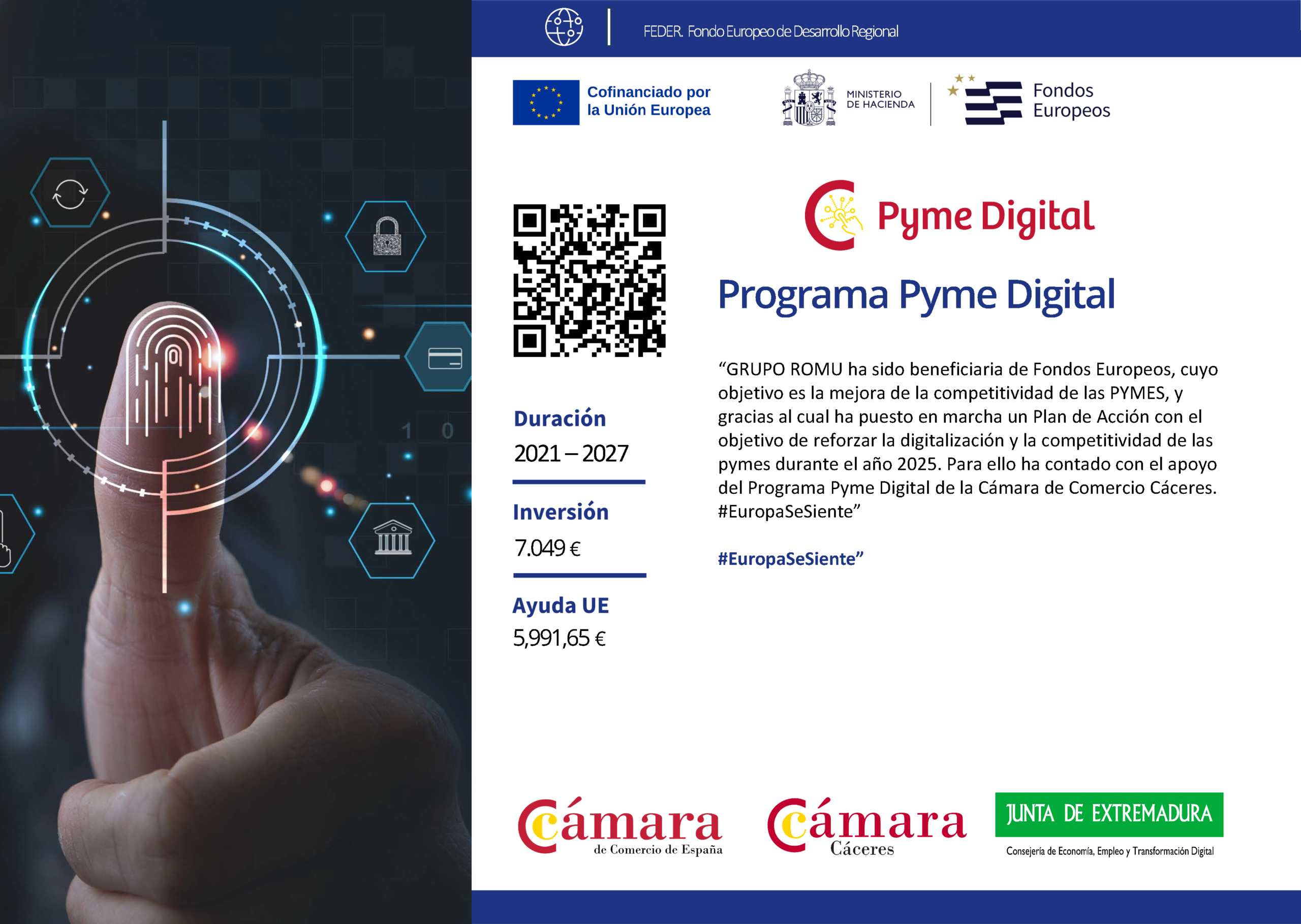 GRUPO ROMU ha sido beneficiaria del Fondo Europeo de Desarrollo Regional cuyo objetivo es la mejora de la competitividad de las PYMES, y gracias al cual ha puesto en marcha un Plan de Acción con el objetivo de reforzar la digitalización y la competitividad de las pymes durante el año 2025. Para ello ha contado con el apoyo del Programa Pyme Digital de la Cámara de Comercio de Cáceres.